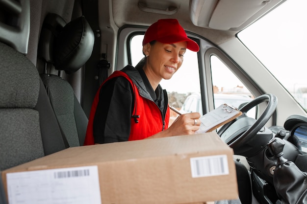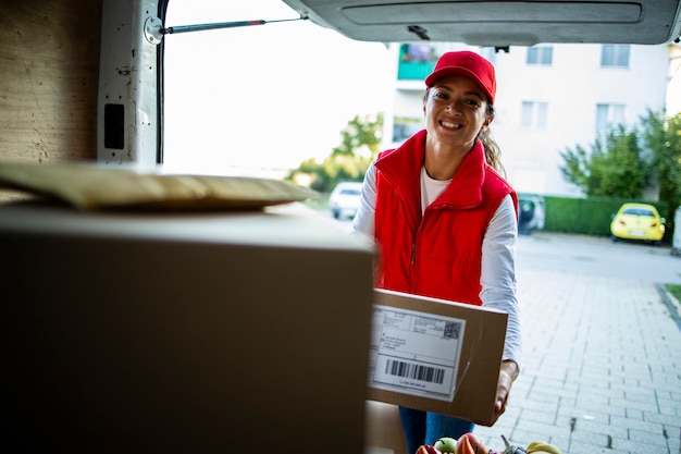 joven mensajero su colega descargando cajas carton furgoneta reparto 637285 2293